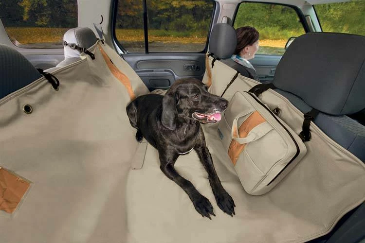 Deze beige hondendeken beschermt de gehele achterbank van uw auto. De hangmat plaatst u tussen de voorstoelen en de achterstoelen. De hondendeken wordt op zes verschillende punten vastgemaakt: aan de beide hoofdsteunen van de voorstoelen, aan de beide hoofdsteunen van de achterstoelen en twee elastische banden aan de onderzijde die u in de hoeken vastmaakt.