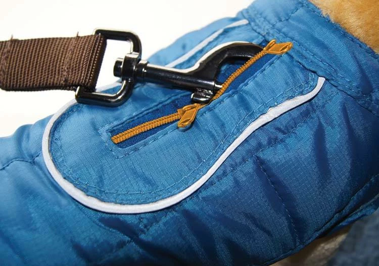 De warme hondenjas is waterafstotend en is voorzien van een rits aan de bovenzijde zodat u het hondentuig of hondenharnas kunt aanlijnen. De bies is reflecterend voor extra zichtbaarheid.