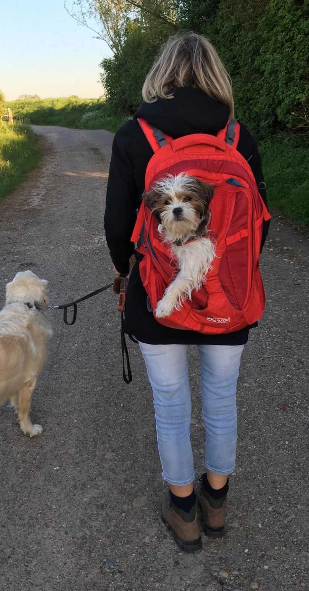 Dit is een stevige rode hondenrugzak waarmee u een kleine hond kunt dragen op de rug. Ook kunt u de rugzak gebruiken als een traditionele hondendraagtas, want de rugzak heeft ook een handvat aan de voorzijde. Het raam van mesh maakt het voor de hond mogelijk om naar buiten kijken. Dit raam kan ook opgerold worden zodat de hond de kop naar buiten kan steken.