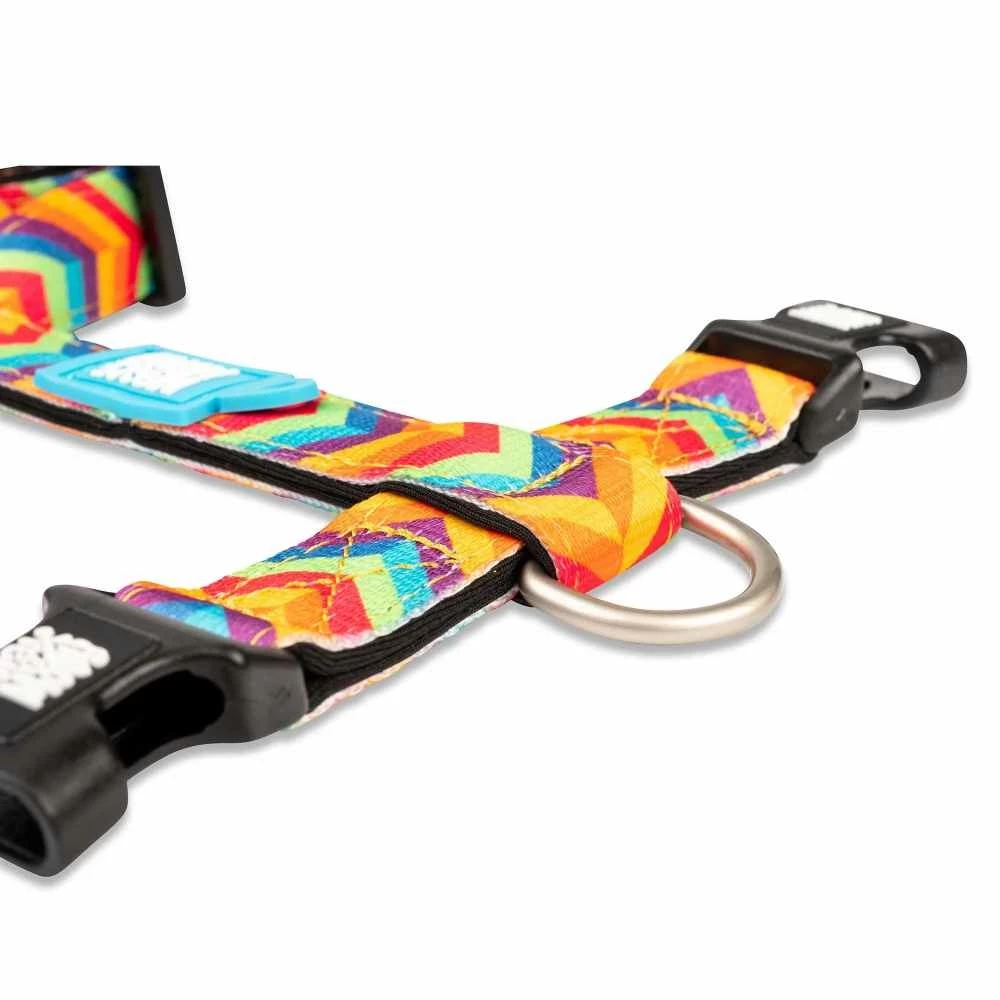 Dit is een hip en opvallend hondentuig met een regenboog kleuren print. Maak een echte eye catcher van uw hond ! Het tuig is voorzien van een twee sterke kliksluitingen en heeft twee D-ringen op de rug. Het tuig is aan de binnenzijde gemaakt van neopreen en heeft sterk polyester aan de buitenzijde. Het tuig is op drie plekken te verstellen voor een optimaal pasformaat. Een tuig mag namelijk met de huid meebewegen maar niet uit zichzelf alle kanten op schuiven! Het tuig is bij de borst, op de rug en op de buik te verstellen. U kunt het tuig reinigen op max. 30 graden. De bijpassende verstelbare hondenriem vindt u hier. Ook is er een korte hondenriem leverbaar, deze vindt u hier.
