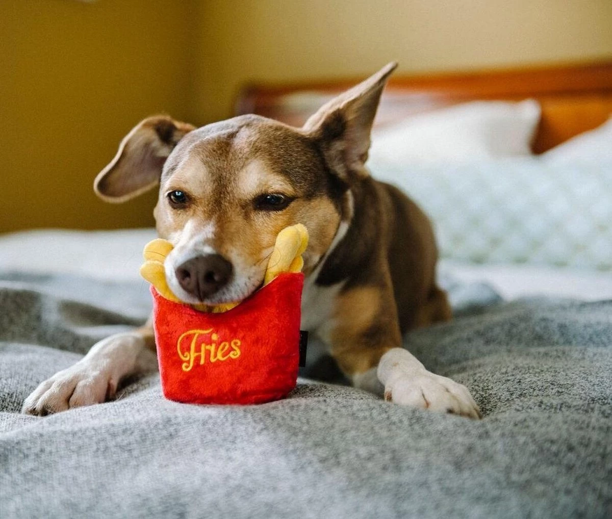 Weer zo’n echte Amerikaanse klassieker zijn de French Fries, oftewel een zakje friet. Wie kent ze niet ? En nu is er dit leuke hondenspeeltje. Het bestaat uit twee delen: het zakjes en de frietjes. Er zitten diverse piepers in die verschillende geluidjes maken. Het hondenspeelgoed is gemaakt van zacht pluche. Bij het spelen maakt het speelgoed grappige geluidjes.Â