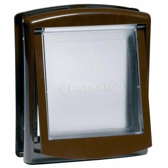 Dit bruine hondenluik kent een klassieke twee standen vergrendeling: open of dicht.