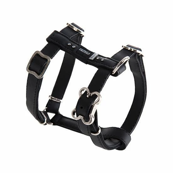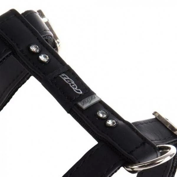 Dit is een leuk zwart verstelbaar hondentuig voor de kleinere honden. Het tuigje is van 100% nylon en aan de buitenkant afgezet met PLU kunstleer. Enkele stras steentjes zorgen voor een leuk bling effect. De gesp is in de vorm van een botje.