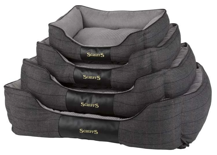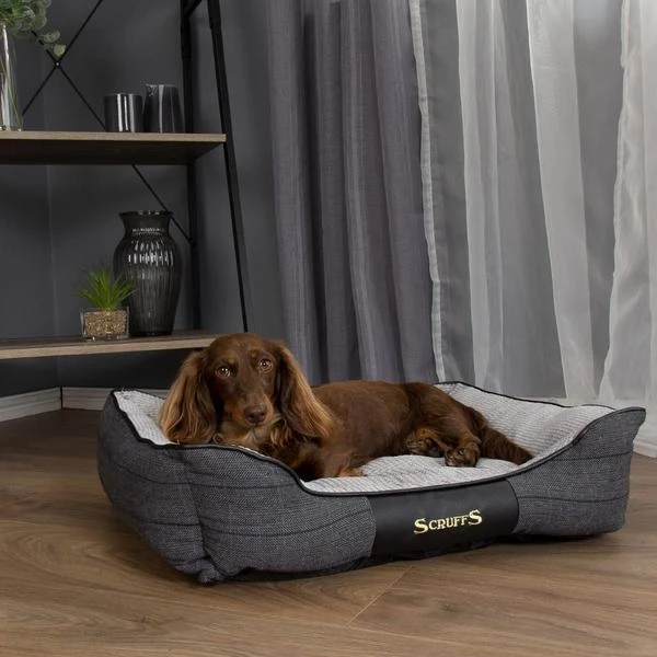 Deze hondenmand heeft een chique uitstraling. De buitenzijde van de hondenmand is uitgevoerd in een grijze tweed stof en de binnenzijde in een contrasterende Chenille stof. De mand biedt een heerlijke rustplaats voor uw huisdier. De mand is afgewerkt met biezen van imitatie suède. Aan de voorzijde is het geborduurde logo van Scruffs verwerkt. De onderkant van de hondenmand is voorzien van een anti-slip laag.