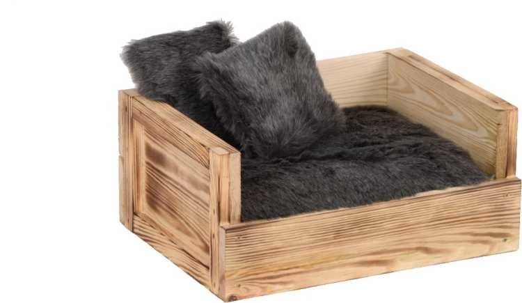 Een prachtige handgemaakte massief houten hondenmand voor de kleinere hond. Uw hond zal er heerlijk in kunnen rusten, want de hondenmand wordt compleet geleverd met een zacht pluche ligkussen en twee sierkussens. De kussens zijn gevuld met fleece.Â