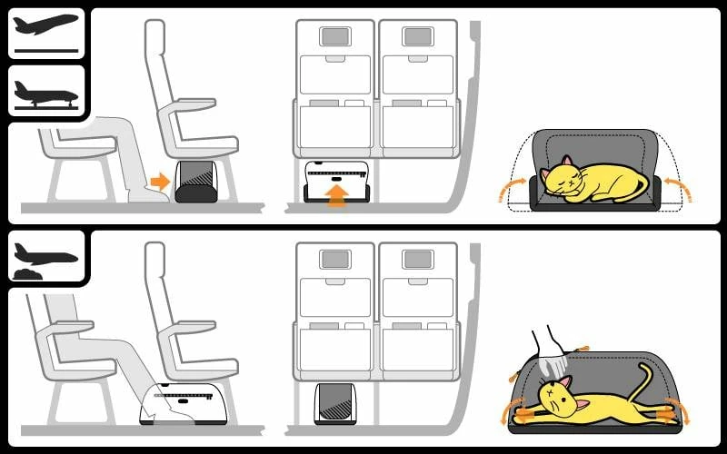 Een hondentas die niet onder de stoel in de cabine past, is nu verleden tijd. De bijzondere hondendraagtas geeft uw huisdier de grootst mogelijke ruimte tijdens de vlucht en kan ook nog steeds onder de stoel geplaatst worden tijdens de start en de landing. Als de stoelriemen uit mogen en u de stoel mag verstellen, kunt u de draagtas draaien en tussen uw voeten plaatsen. Hierdoor heeft uw huisdier de grootst mogelijke ruimte in de tas en kunt u zelf ook comfortabel genieten van uw vlucht.