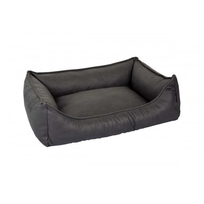 Een robuuste en comfortabele donkergrijze kunstleren mand met een vulling van koudschuim. Het gebruikte kunstleer heeft een echte cowboys look door de duidelijke nerf met structuur en gevlamde kleurschakering. Het eerste klas kunstleer is gemakkelijk te reinigen met een vochtige doek en een stofzuiger. Een ander voordeel van kunstleer is dat ongedierte er niet in kan gaan nestelen en ook huidschilfers van het materiaal afglijden, waardoor er geen ongedierte op af kan komen.