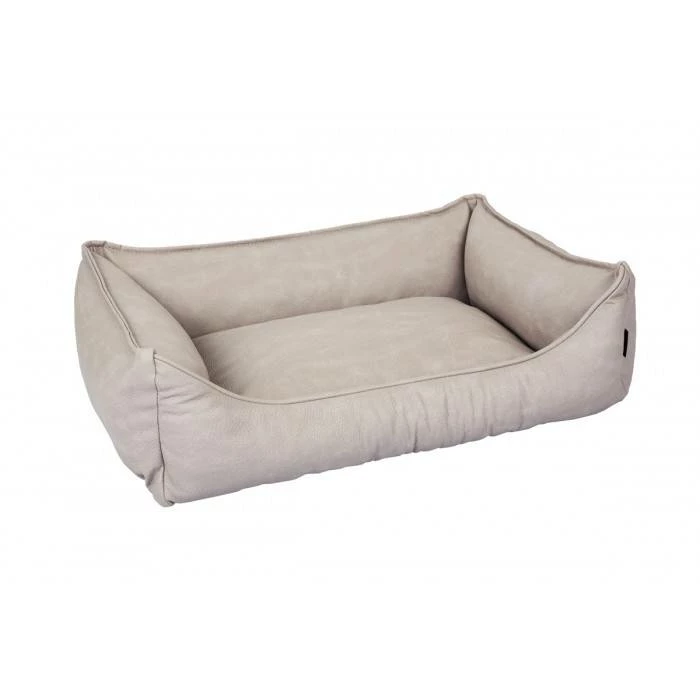Een robuuste en comfortabele lichtgrijze kunstleren mand met een vulling van koudschuim. Het gebruikte kunstleer heeft een echte cowboys look door de duidelijke nerf met structuur en gevlamde kleurschakering. Het kunstleer van hoge kwaliteit is gemakkelijk te reinigen met een vochtige doek en een stofzuiger. Een ander voordeel van kunstleer is dat ongedierte er niet in kan gaan nestelen en ook huidschilfers van het materiaal afglijden, waardoor er geen ongedierte op af kan komen.